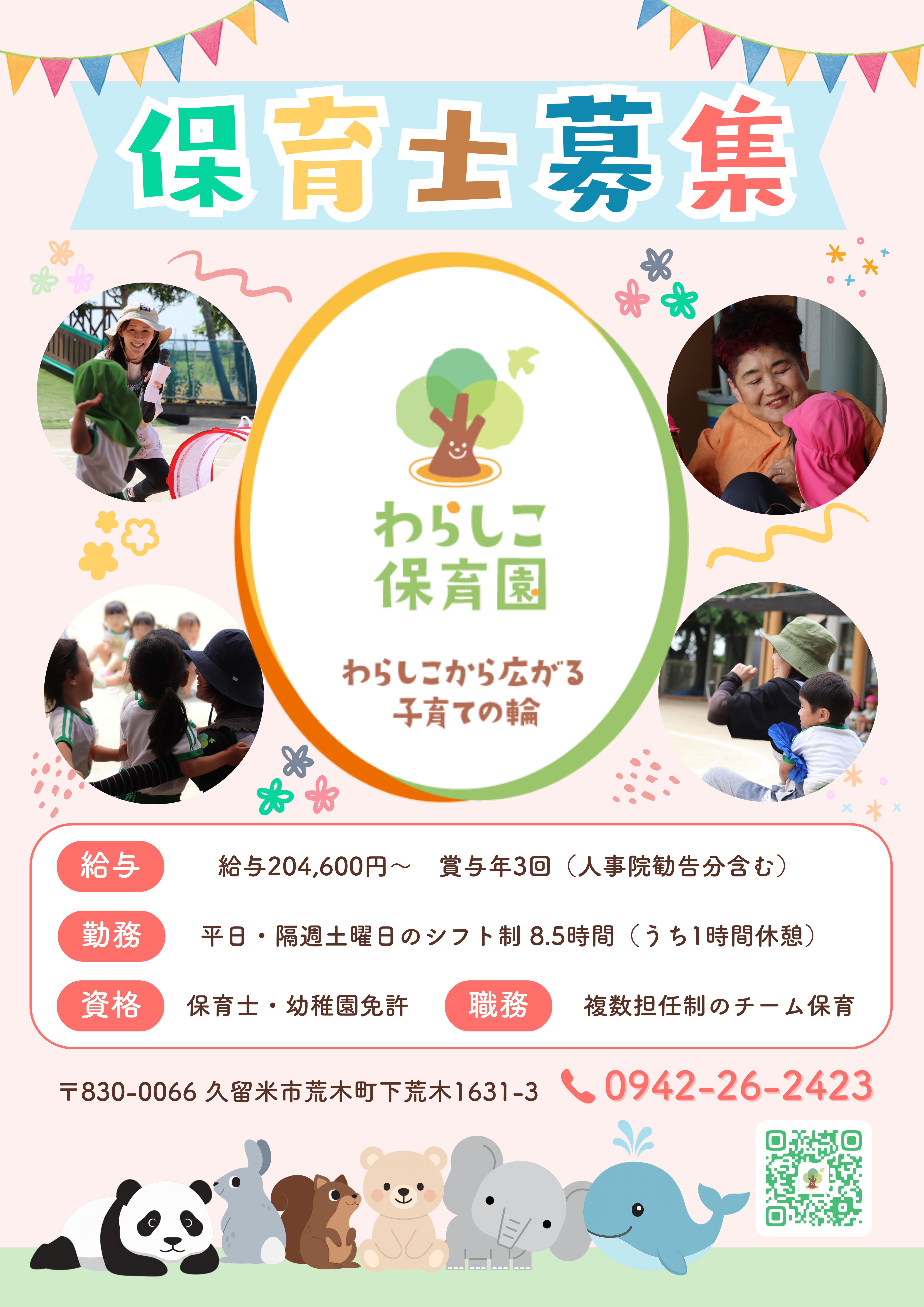 わらしこ保育園の「スタッフ募集」ページをご覧くださり、ありがとうございます。